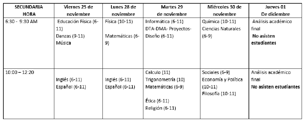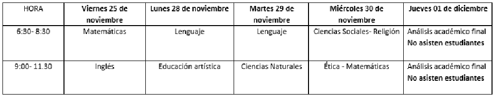 De la manera más atenta nos permitimos informar el cronograma de finalización de actividades del presente año y el horario de recuperaciones finales, les recordamos que las actividades planteadas son de estricto cumplimiento y solicitamos su colaboración para que sus hijos muestren todo el interés posible en la realización de las actividades de recuperación para finalizar el año alcanzando los logros propuestos.